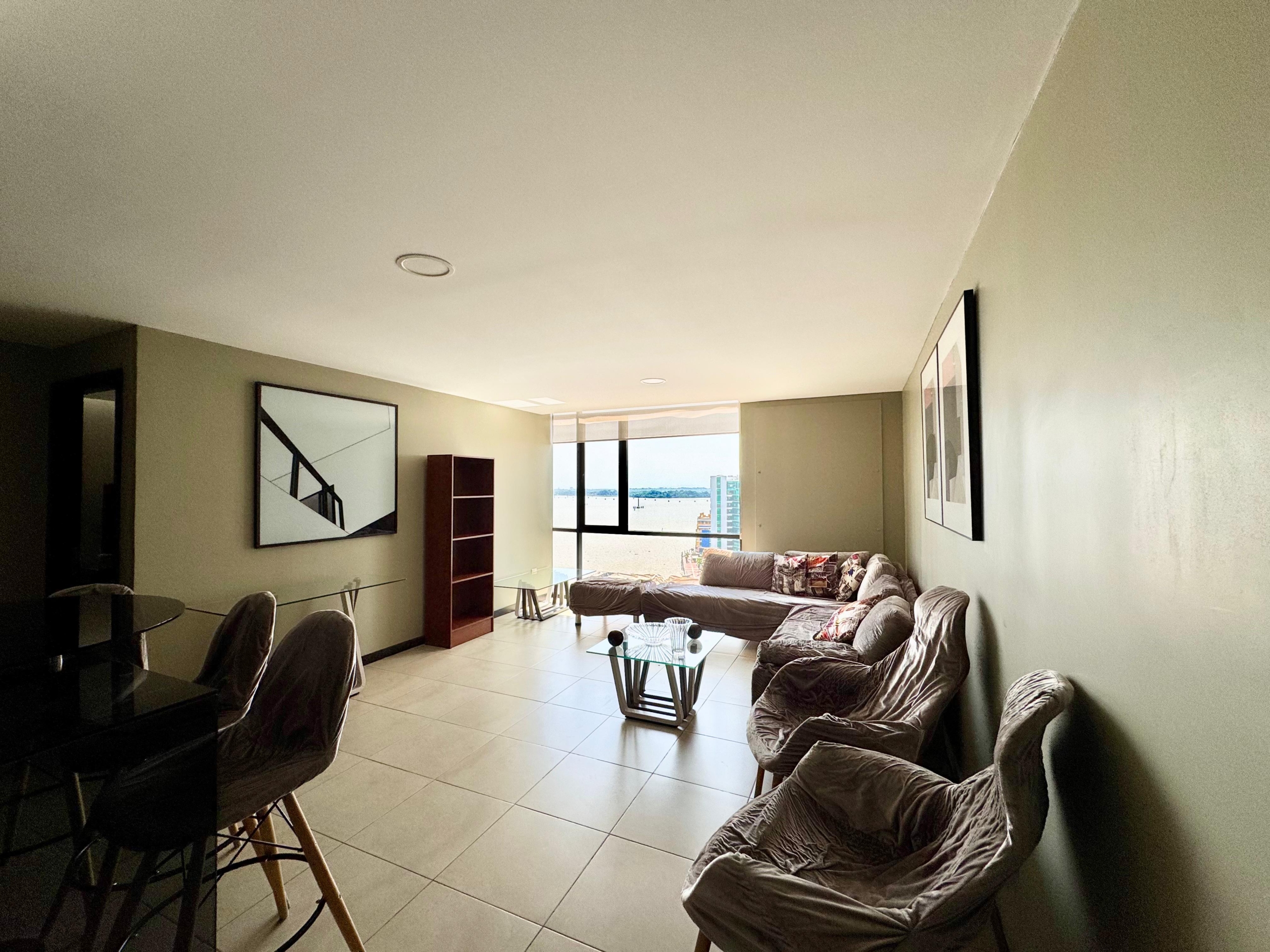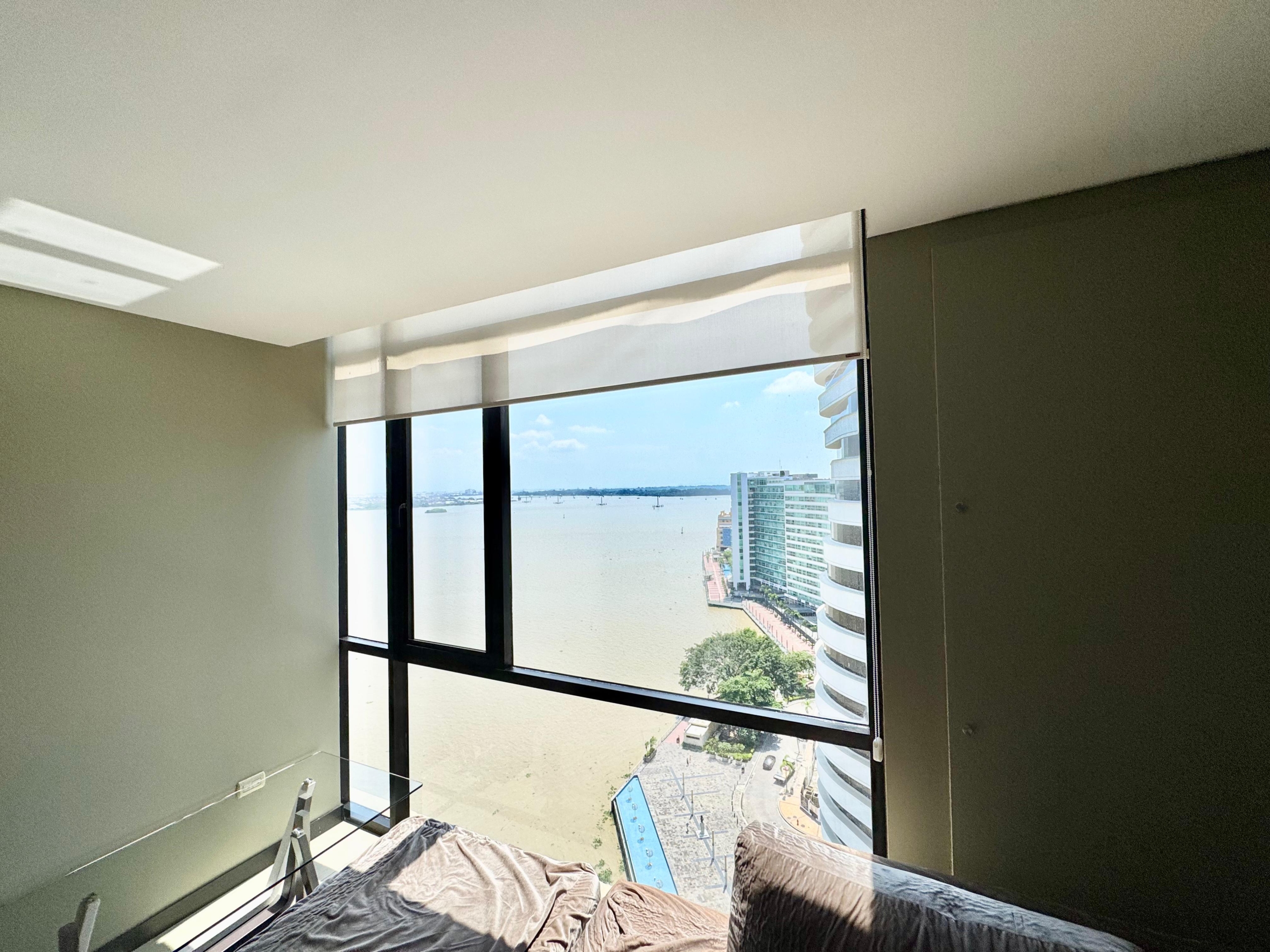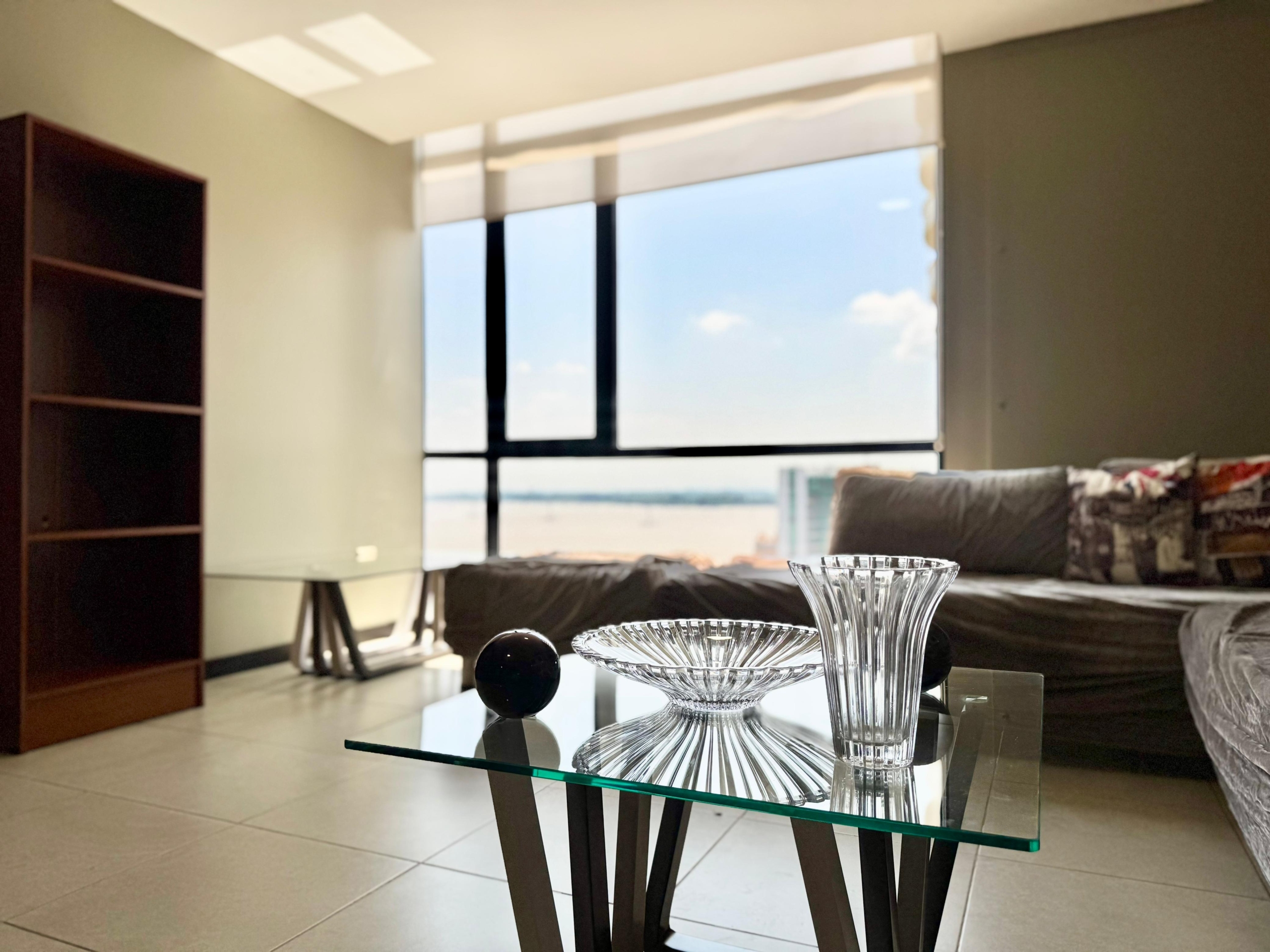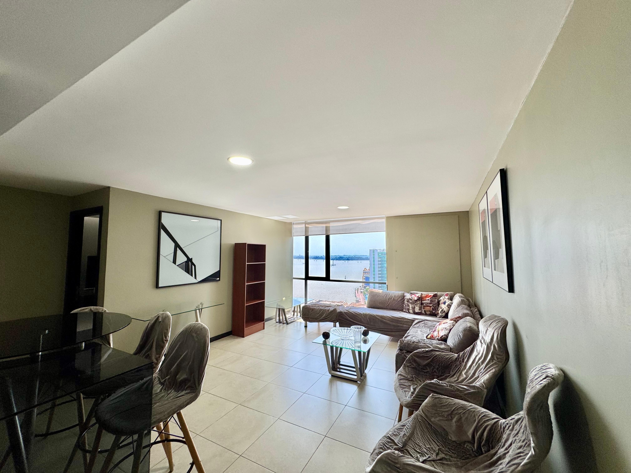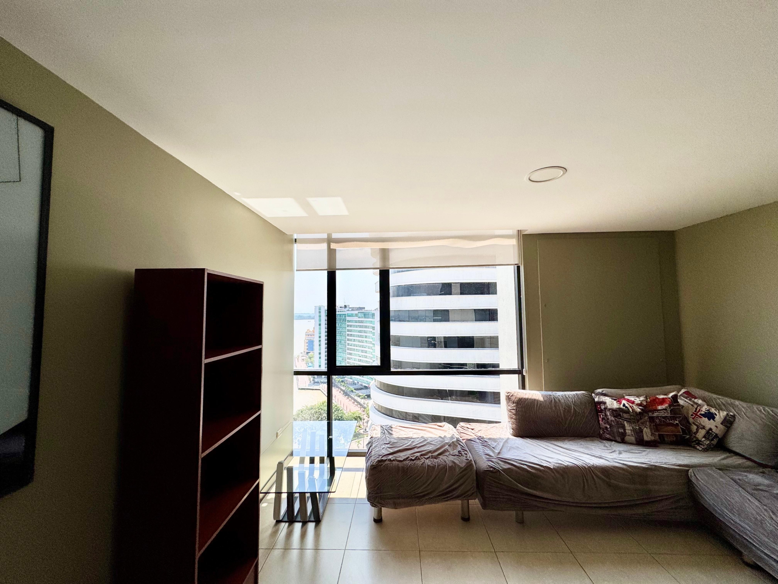 El departamento esta ubicado en el piso 15, tiene vista directa al rio, cuenta con 1 habitación, 1 baño completo, 1 walking closet, cocina, lavandería, sala, piscina en el edificio, gimnasio, bbq, hall servicio, ascensor.