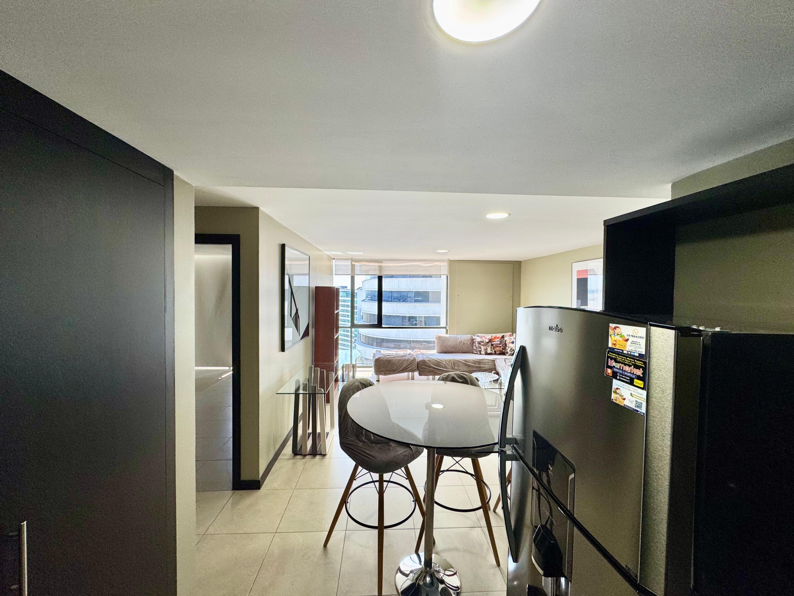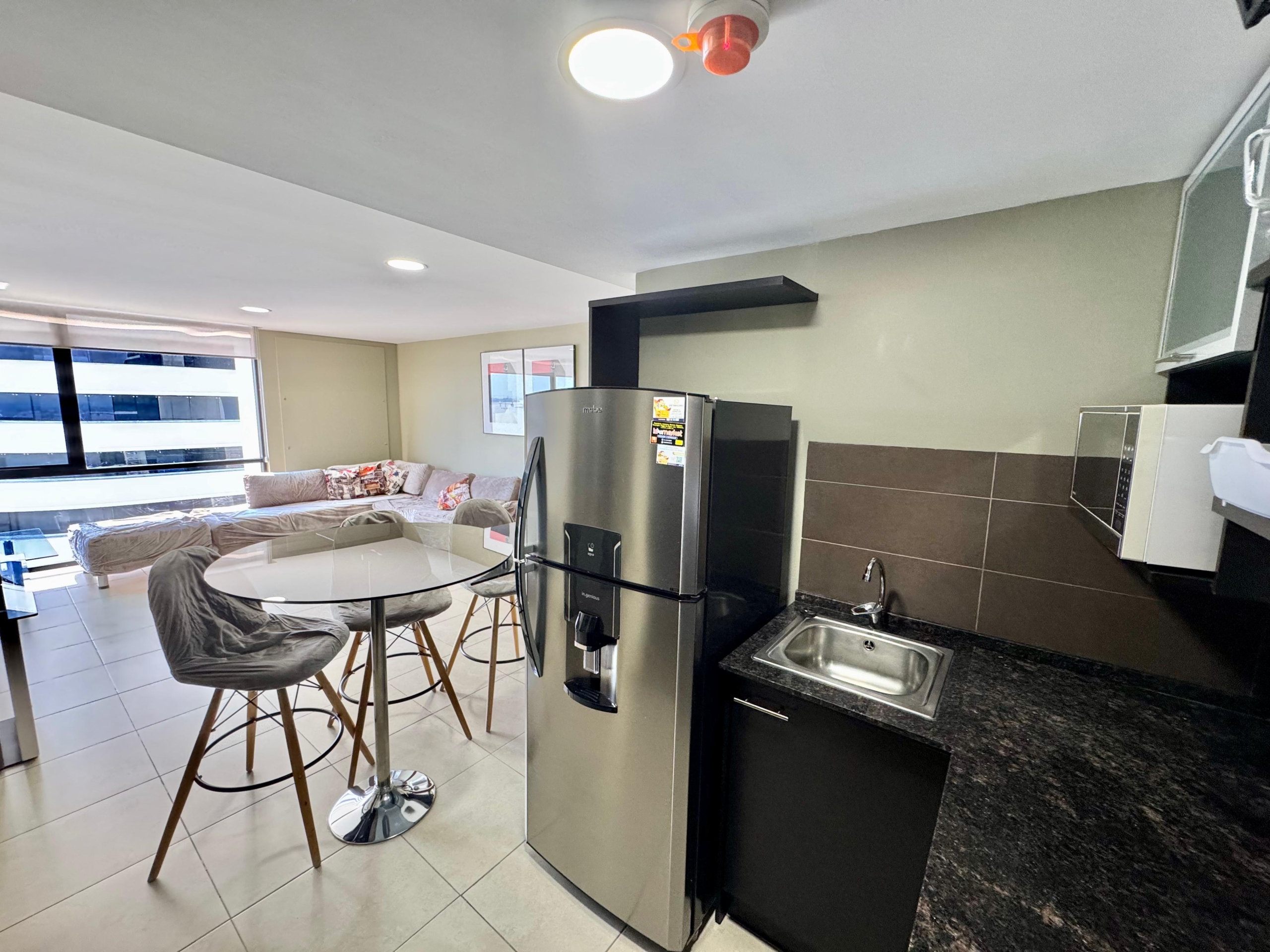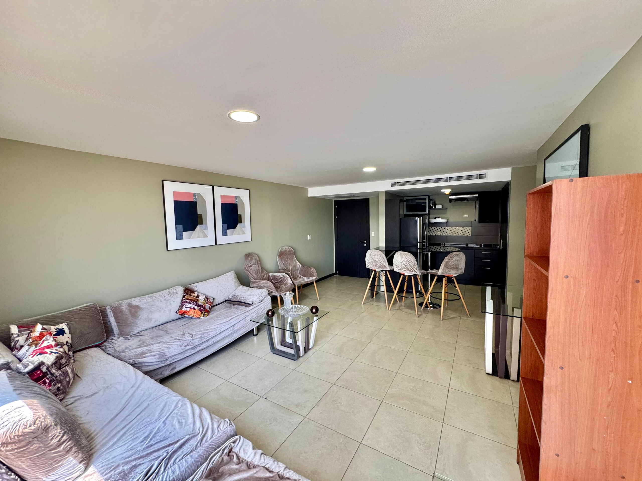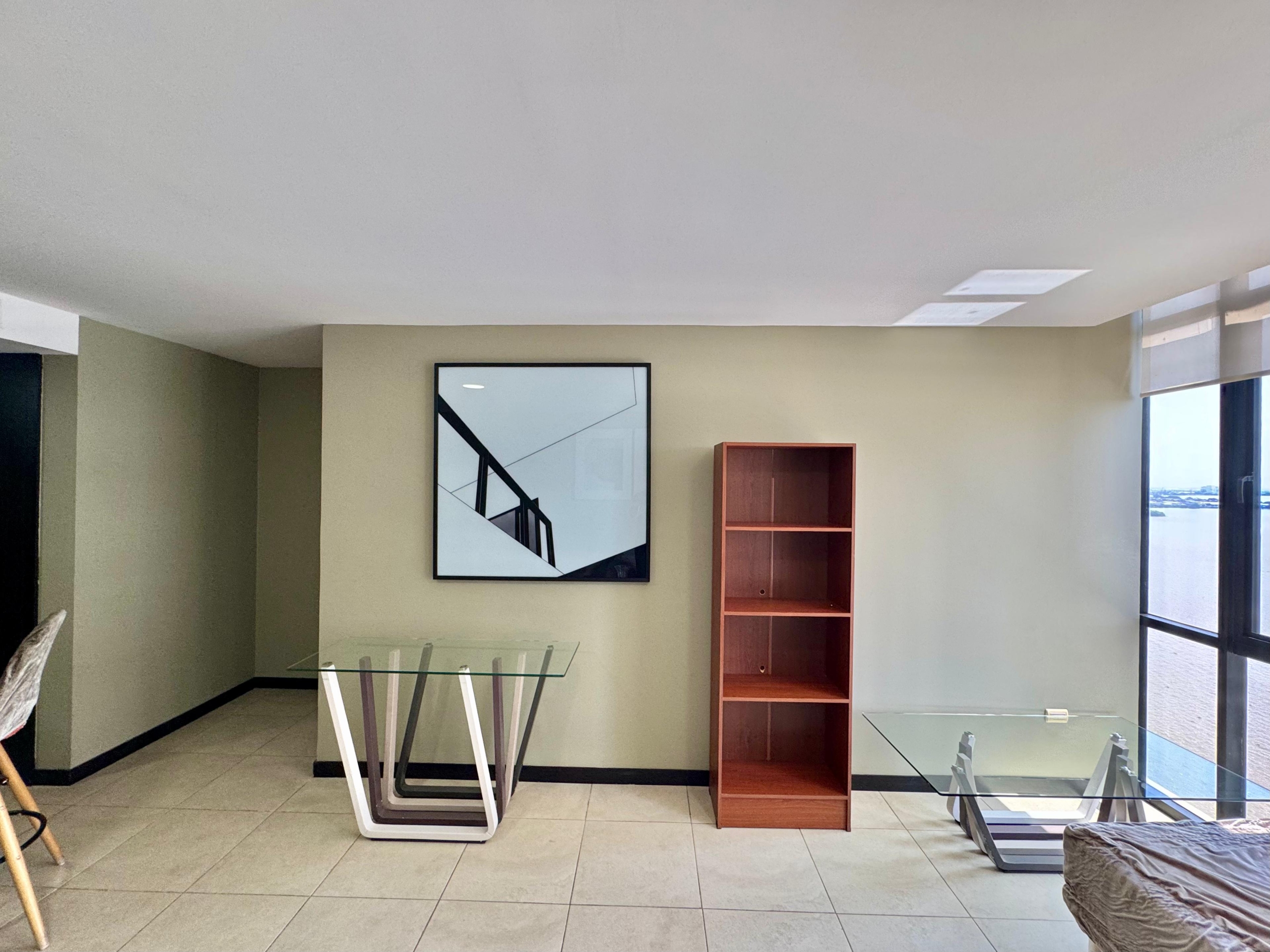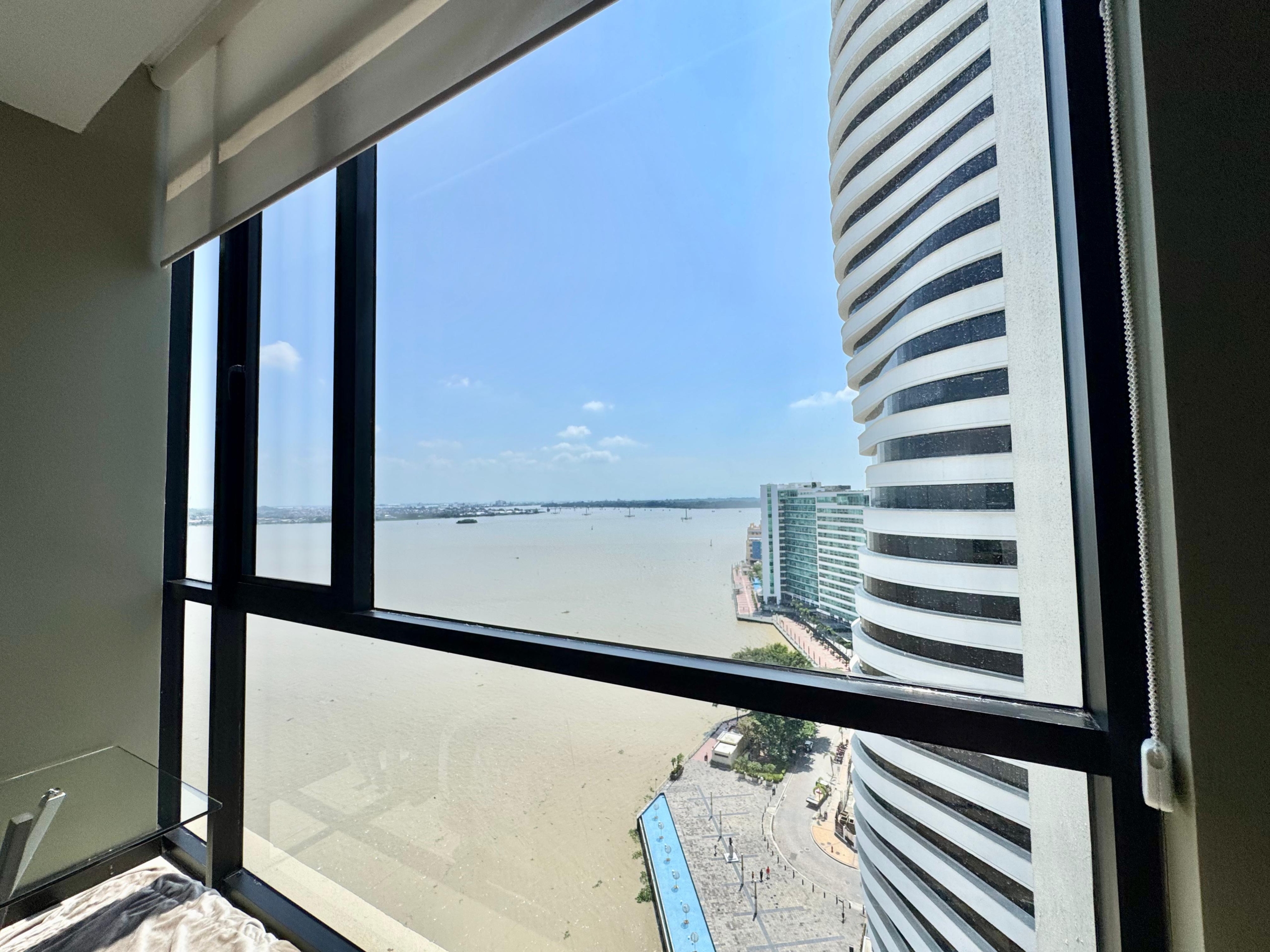 El departamento esta ubicado en el piso 15, tiene vista directa al rio, cuenta con 1 habitación, 1 baño completo, 1 walking closet, cocina, lavandería, sala, piscina en el edificio, gimnasio, bbq, hall servicio, ascensor.