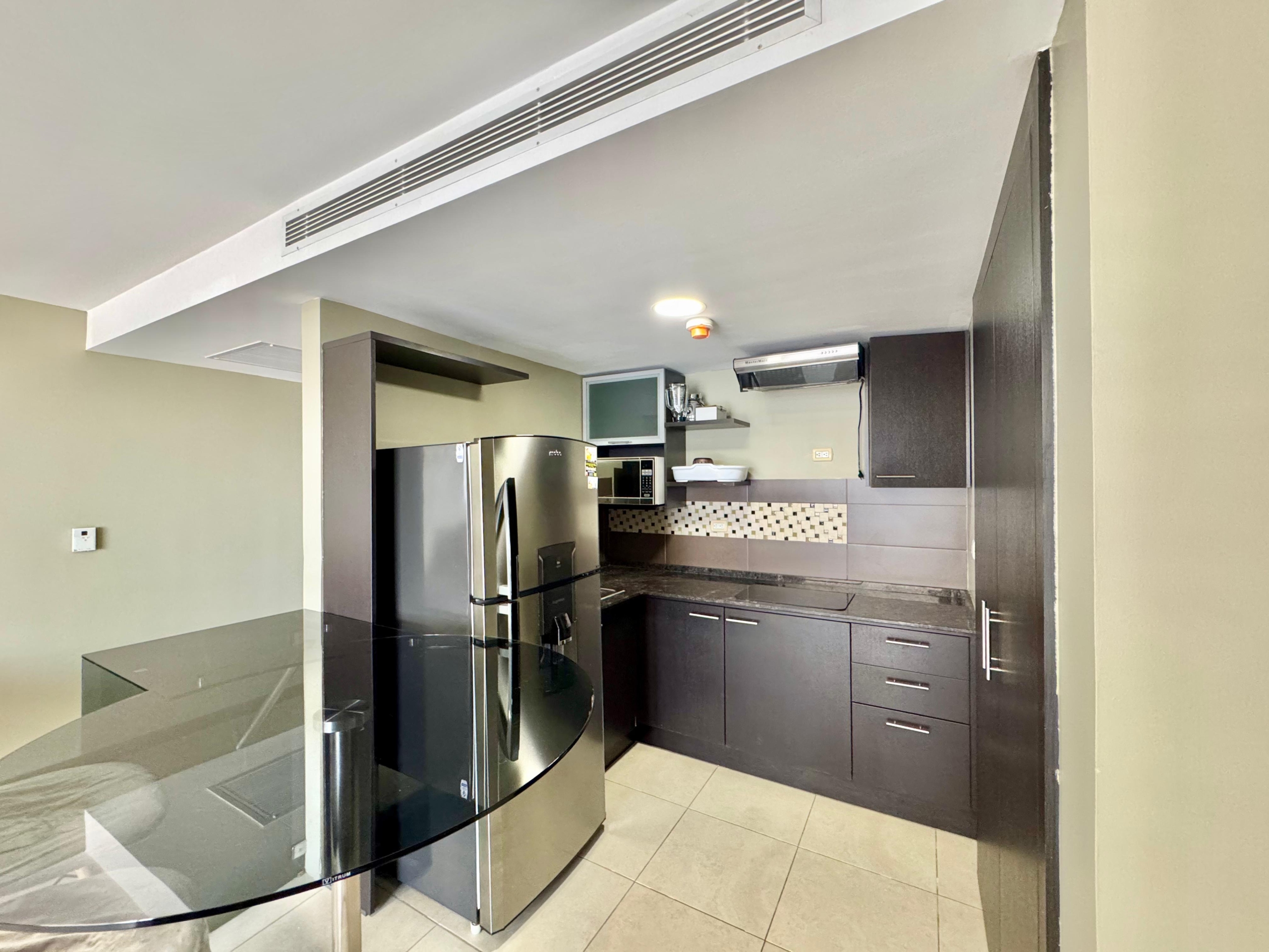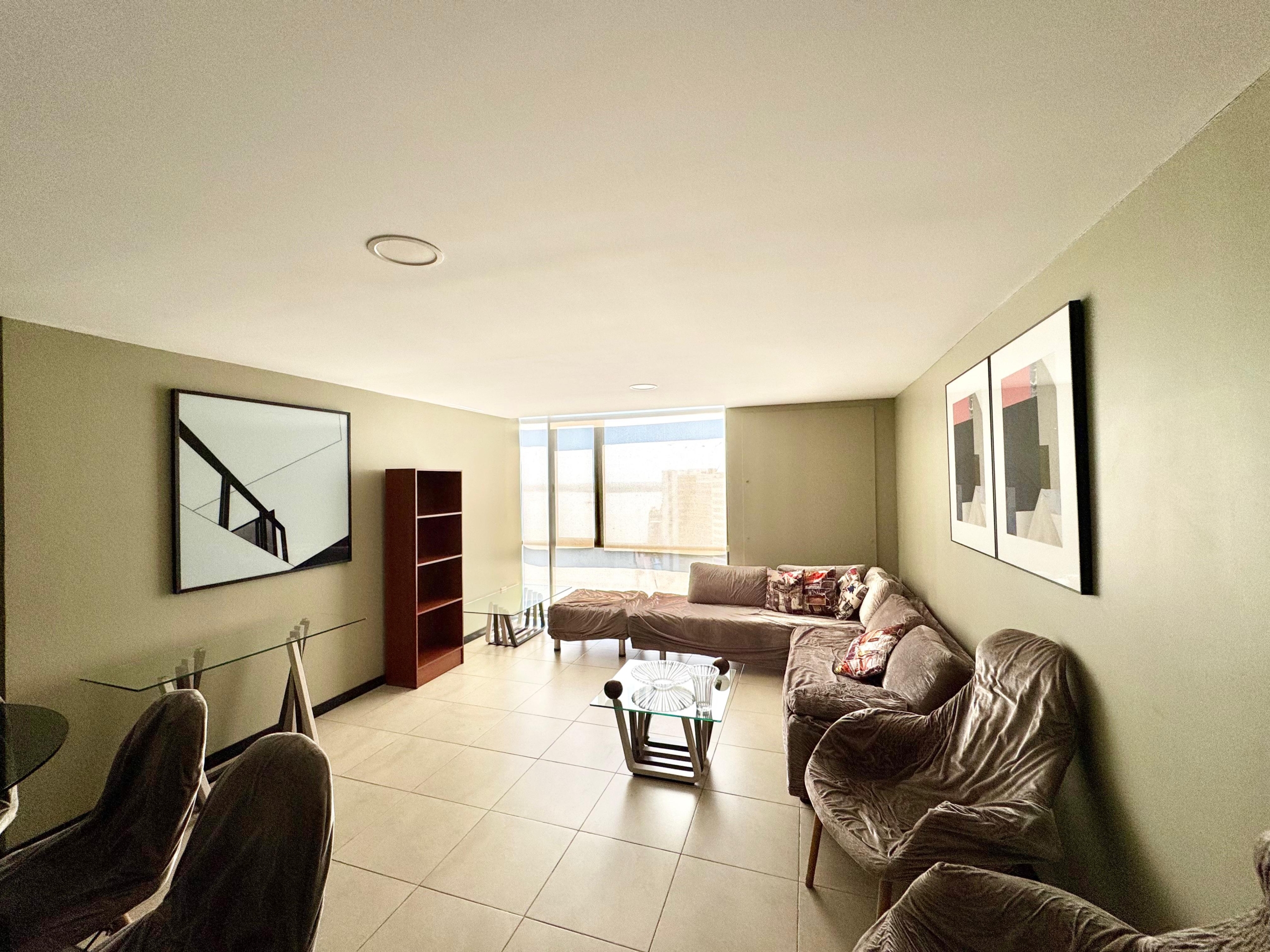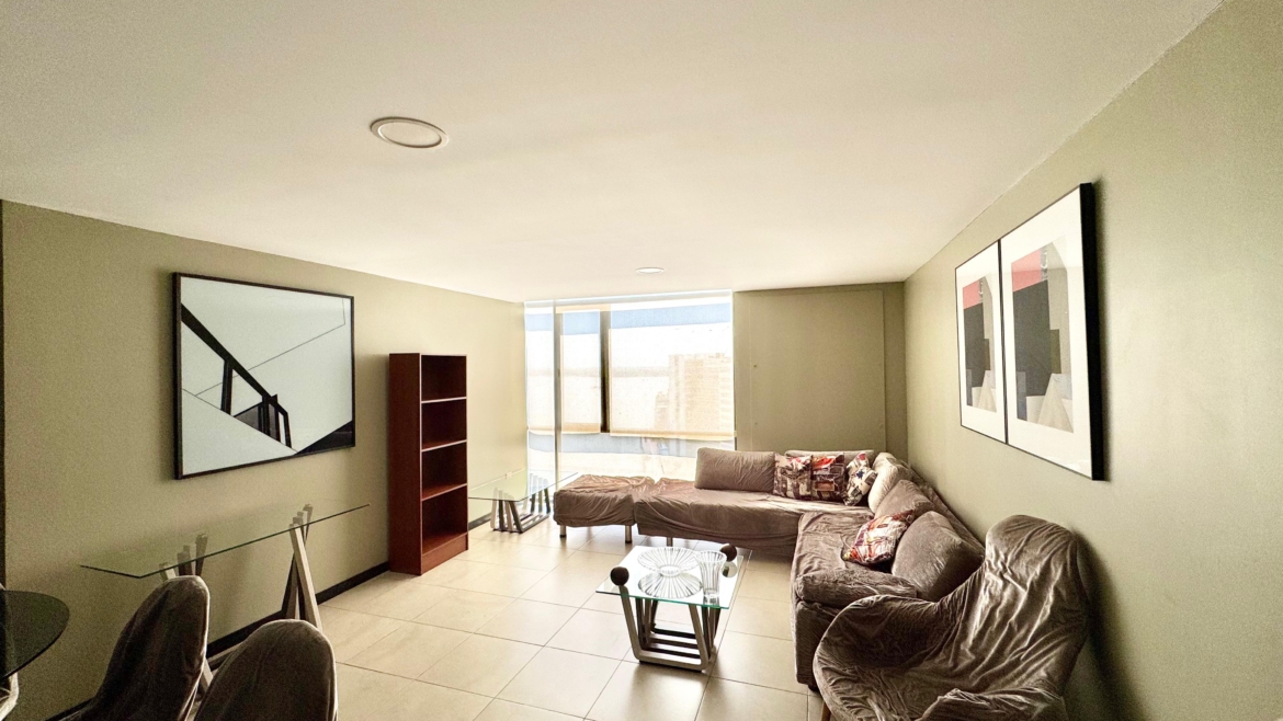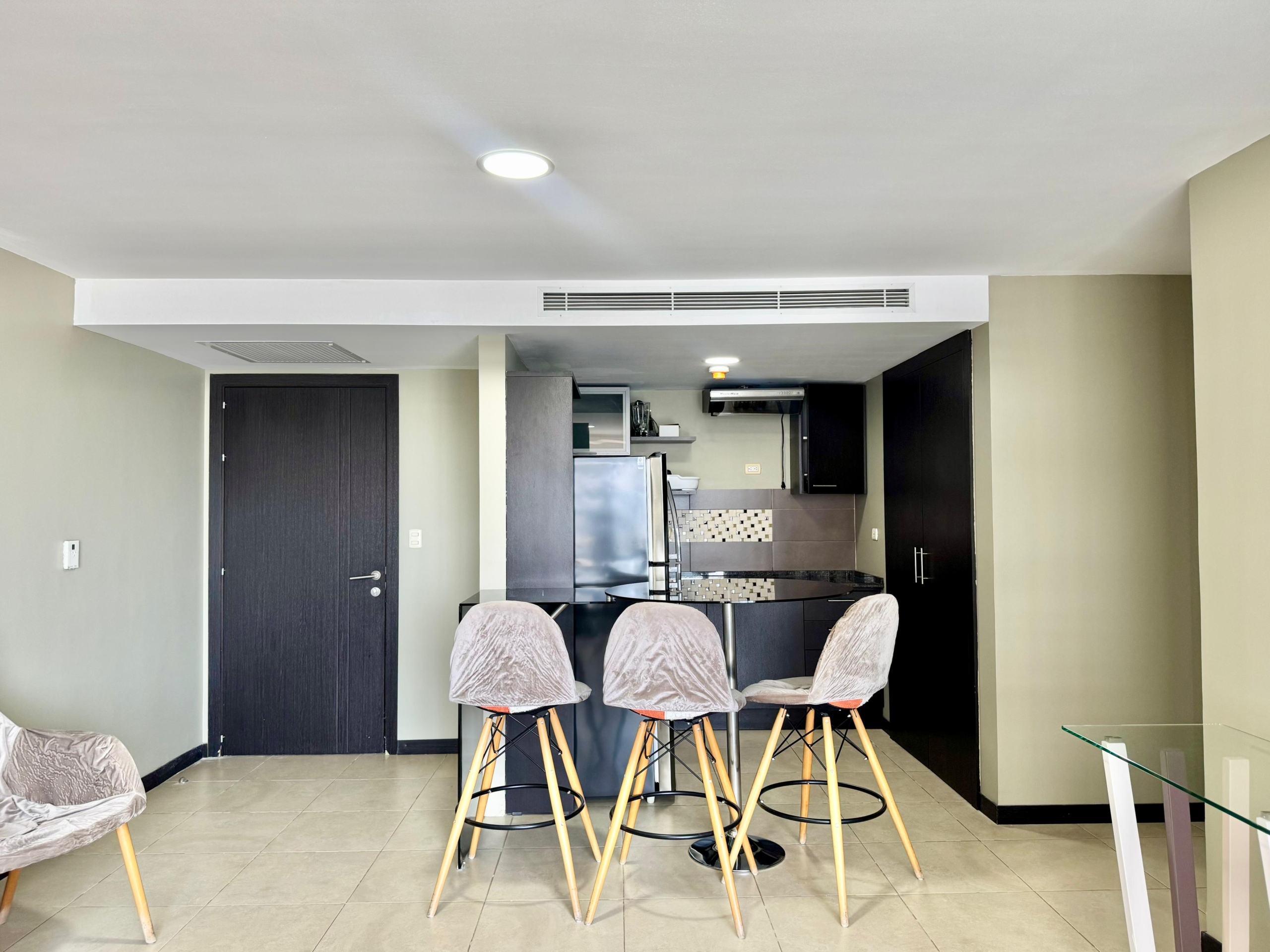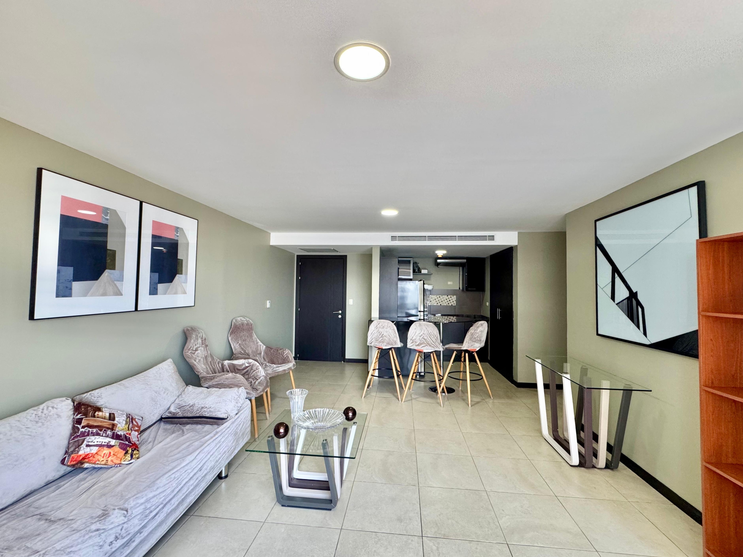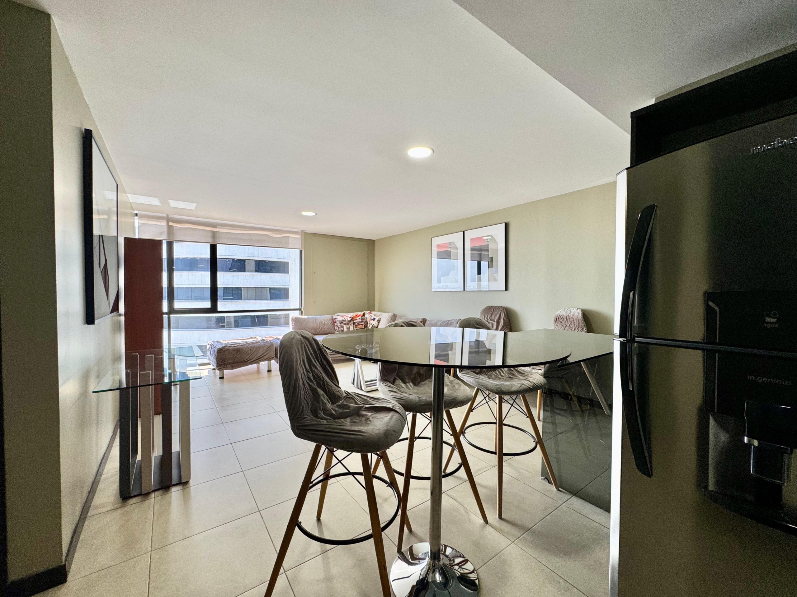 El departamento esta ubicado en el piso 15, tiene vista directa al rio, cuenta con 1 habitación, 1 baño completo, 1 walking closet, cocina, lavandería, sala, piscina en el edificio, gimnasio, bbq, hall servicio, ascensor.