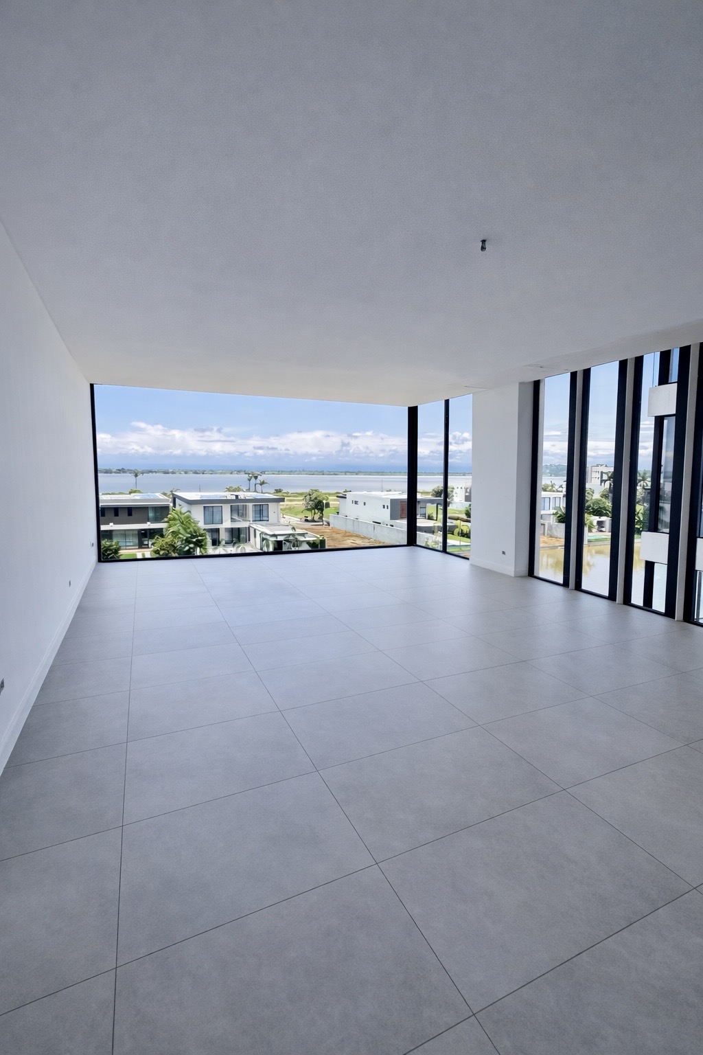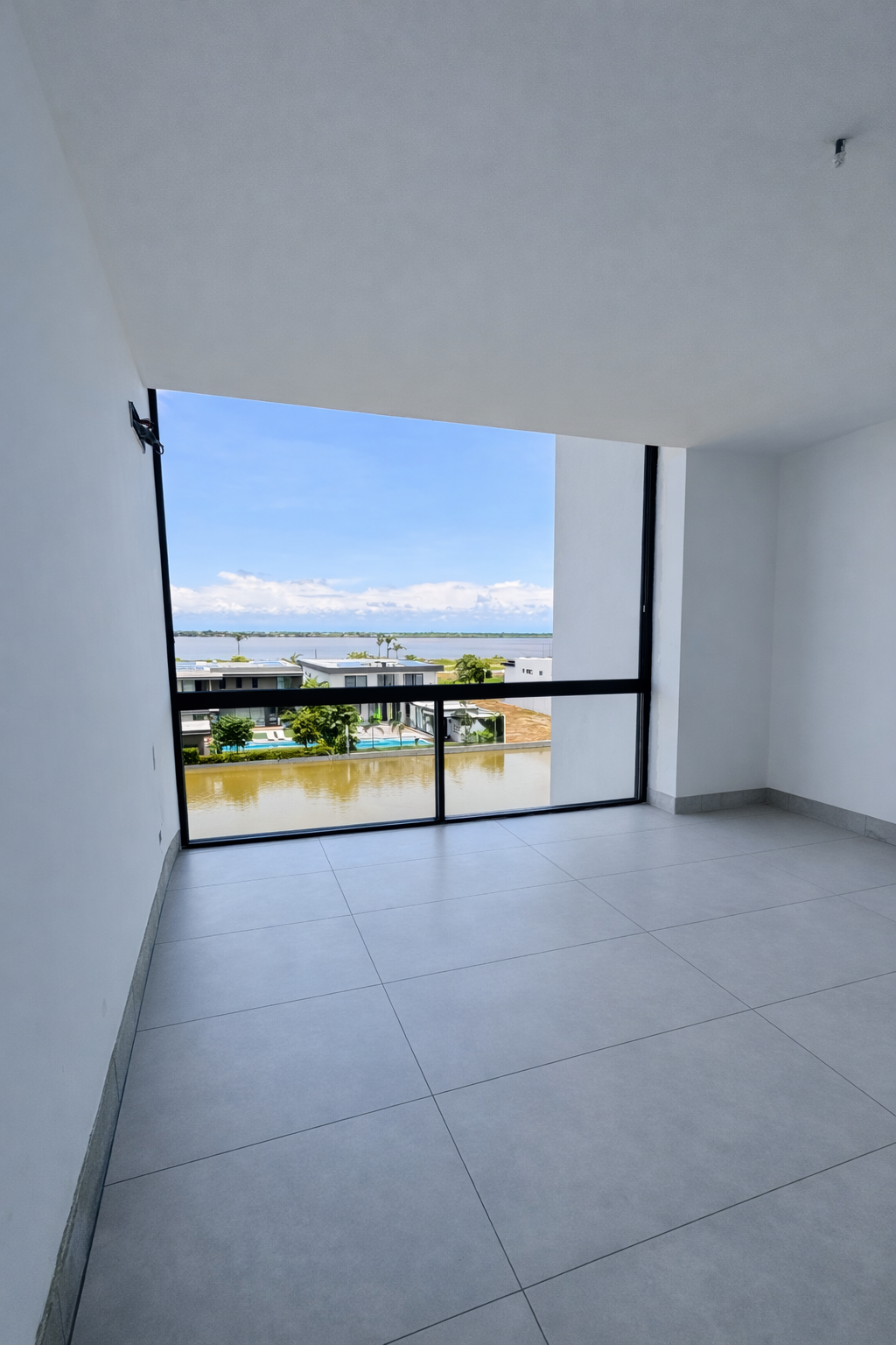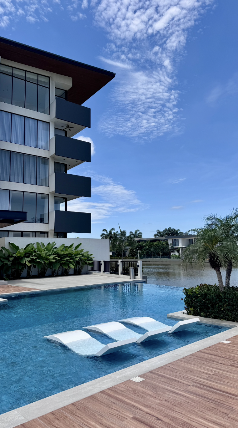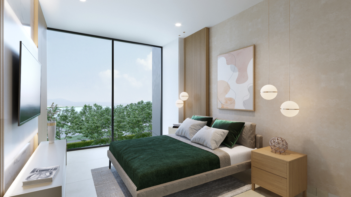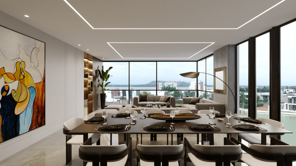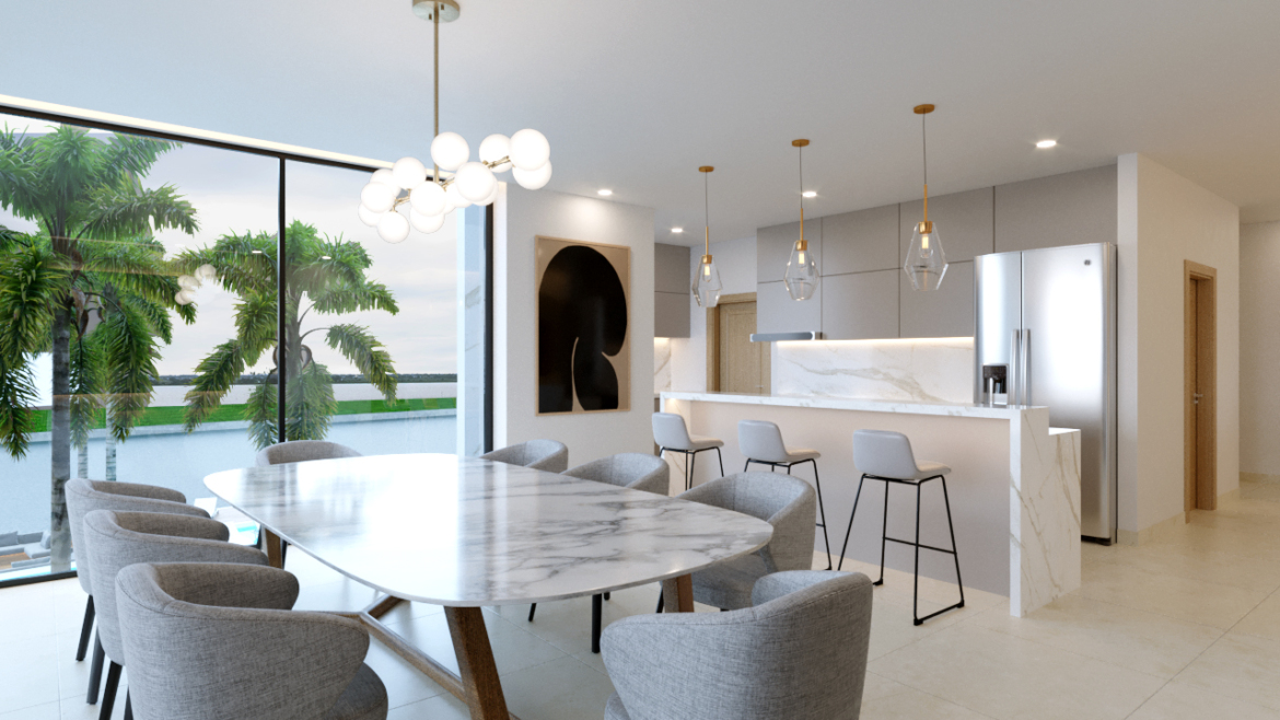 El área social integra sala, comedor y moderna cocina americana, creando un ambiente amplio y elegante, ideal para disfrutar de una impresionante vista panorámica directa al lago e indirecta al río, con excelente iluminación natural.
